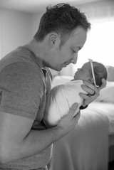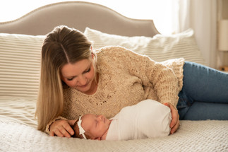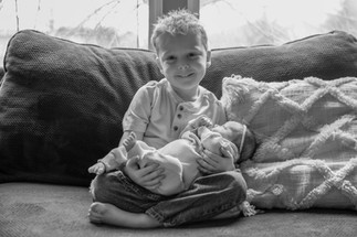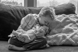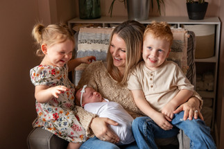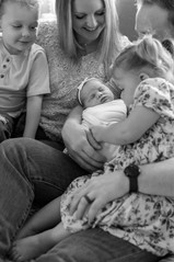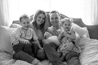 We began the Finne family's in home newborn session by the cutest welcoming committee, their two oldest children, Landon and Rosie waiting excitedly at the front porch for our arrival. As soon as we walked into their Arlington, WA home, we could just feel the love that the home was filled with. It was like a huge sigh, these were our kind of people and even though we just met them, we knew this was going to be an amazing session. As soon as we caught wind that Bryan played guitar Trysha had a vision, "We HAVE to get him to play guitar to his family while they are all snuggled up together." Bryan understood the assignment, grabbed his guitar and began comfortably strumming to his beautiful family. Nailed it! After that, it was a session filled with lots of snuggling, jokes, play breaks and maybe a marshmallow bribe or two. Baby Charlotte even smiled in her bunny outfit, it must have been her favorite (ours too)! In the end, we got all the shots we set to capture and everyone was ready for a nice relaxing nap. Thank you Finne Family for inviting us into your loving home, we cannot wait to watch your family grow!